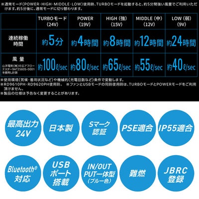 | 【特徴】 | 空調風神服ジャパンラベルがさらに進化! 長時間稼働できる長持ちバッテリー! しかも充電時間はより短く! ◆最高出力24V・2026年ファンと組み合わせると最大100リットルの風! ◆HIGH(強)モードで約8時間連続稼働可能な長持ちバッテリー! ◆しかも充電時間は約3.5時間で短い! ◆PSEマーク取得で安全安心! ◆Bluetooth対応モデルだから空調風神服アプリで操作可能! ◆しかもアプリから操作すれば出力ボルトを1V単位で調節可能! ◆バッテリー本体は安心の日本製 ◆出力ボルト数や電池残量が一目でわかるLED表示 ◆ファンと同時にUSB出力可能 ◆バッテリースペック(RD9610PH使用時) ・TURBO(24V):約5分(5分後通常モードに戻ります) ・POWER(19V):約4時間 ・HIGH(15V):約8時間 ・MIDDLE(12V):約12時間 ・LOW(9V):約24時間 ・重量:約345g ・ACアダプター付き |