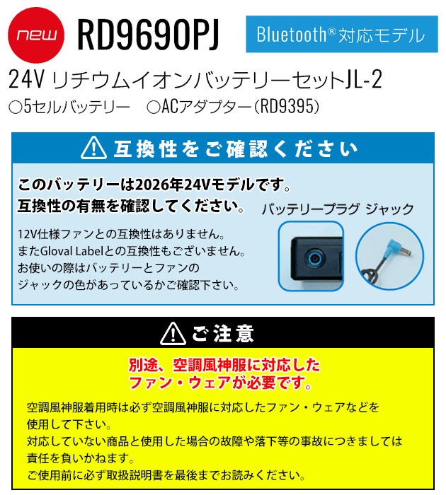 | 【ご注意】 | このバッテリーは2026年ジャパンモデルです。 2023年以降の24Vモデルのファンが使用可能です。 バッテリーとファンを接続するジャックの色が青色のものは互換性があります。 その他のデバイスとは互換性はありません。ご確認の上ご購入ください。 空調風神服ファン・ウェアが必要です。 必ず対応するデバイスを組み合わせてご使用ください。 ご使用の際は取扱説明書をお読みいただき正しくご使用ください。 |