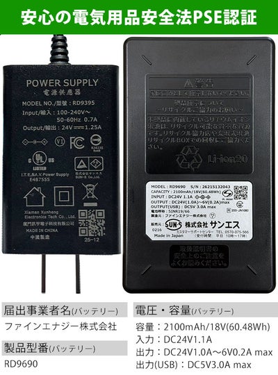 | 【デバイス情報】 | 届出事業者名(バッテリー):ファインエナジー株式会社 製品型番(バッテリー):RD9690 PSマークの種類(バッテリー):PSE 電池容量:2100mAh/18V(60.48Wh) 入力:DC24V1.1A 出力:DC24V1.0A~6V0.2A max 出力(USB):DC5V3.0A max 製品型番(ACアダプター):RD9395 登録検査機関名(ACアダプター):テュフ・ラインランド・ジャパン株式会社 |