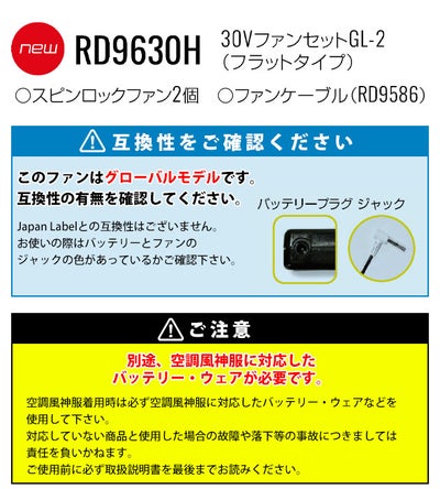 | 【ご注意】 | このバッテリーは2026年グローバルモデルです。 2025年以降のグローバルモデルのバッテリーが使用可能です。 バッテリーとファンを接続するジャックの色が白色のものは互換性があります。 その他のデバイスとは互換性はありません。ご確認の上ご購入ください。 空調風神服ファン・ウェアが必要です。 必ず対応するデバイスを組み合わせてご使用ください。 ご使用の際は取扱説明書をお読みいただき正しくご使用ください。 |