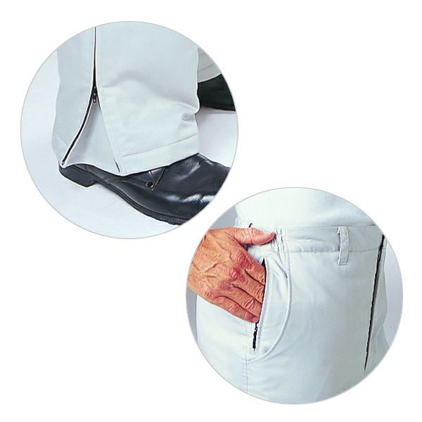1、スルーポケット 2、裾ファスナー 3、ファスナー/フロント:金属 ポケット:コイル(引き手 金属) 裾:コイル(引き手 金属) 4、ボタン/プラスチック 5、帯電防止素材 6、撥水 |
