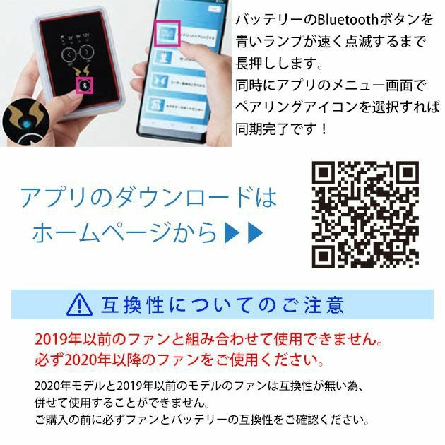 | 【重要】ご使用時の注意 | ◆ファン・ウェアは別売りです。 ◆必ず2020年以降の空調風神服のファンをご使用ください。 2019年以前のモデルのファンとは組み合わせて使用できません。 ◆取扱説明書をよく読み、正しくご使用ください。 |