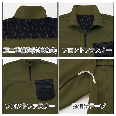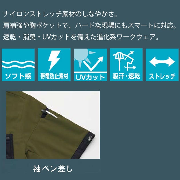 | 【特徴】 | ナイロンストレッチ素材のしなやかさと、接触冷感の心地よさ。 肩補強や両胸ポケットでハードな現場にもスマートに対応。 速乾・消臭UVカットを備えた進化系ワークポロ登場。 ◆快適な着心地が続くストレッチ性 ◆吸汗速乾・UVカットで夏も快適に ◆肩部分二重補強(接触冷感生地) ◆フロントファスナー ◆両胸ファスナーポケット ◆脇消臭テープ ◆袖ペン差し ◆制電対応JIST8118適合 ◆Sサイズはユニセックス対応 |