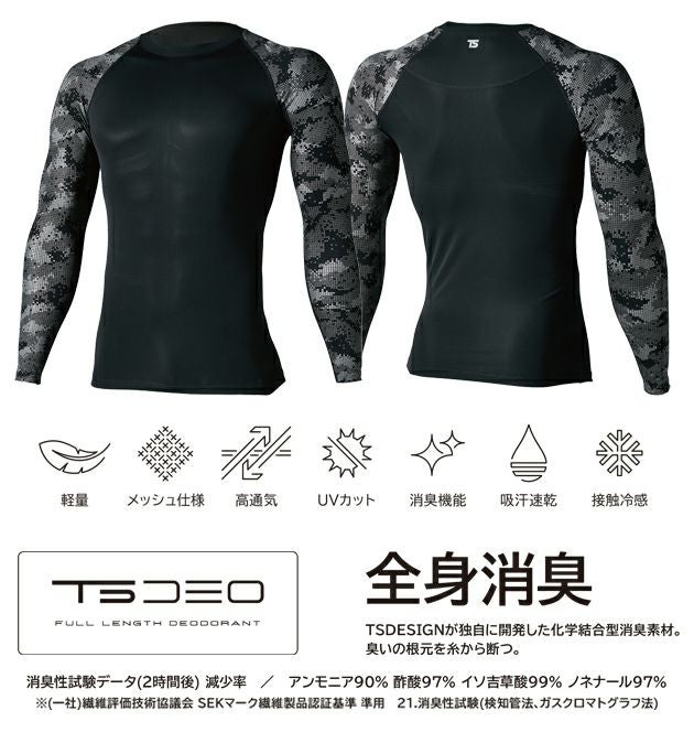 | 【特徴】 | 遮熱+冷感+高通気!特殊な遮熱プリントが夏の日差しをブロック -10℃の体感 酸化チタンのプリント加工「メガクール」による高い遮熱効果があり、通常の素材よりも直射日光による温度上昇を抑える。 素材はアイスエアを使用し、高い通気性と接触冷感性、消臭機能を備える。 ◆全身消臭 TSDESIGNが独自に開発した化学結合型消臭素材。 臭いの根元を糸から断つ。 消臭性試験データ(2時間後) 減少率 / アンモニア90% 酢酸97% イソ吉草酸99% ノネナール97% ※(一社)繊維評価技術協議会 SEKマーク繊維製品認証基準 準用 21.消臭性試験(検知管法、ガスクロマトグラフ法) ・酸化チタンプリントによる遮熱効果(遮熱性試験 JIS L 1951) ・UVカット率約90% ・凹凸のあるメッシュ構造で肌に直接風を感じる様な冷感と高通気性 ・TSDESIGN独自開発の化学結合型消臭素材を使用 ・ドライなタッチ感 ・接触冷感+メッシュによるブースト効果 ・アイスエア ・標裏反射プリント ・左袖ロゴプリント |