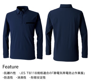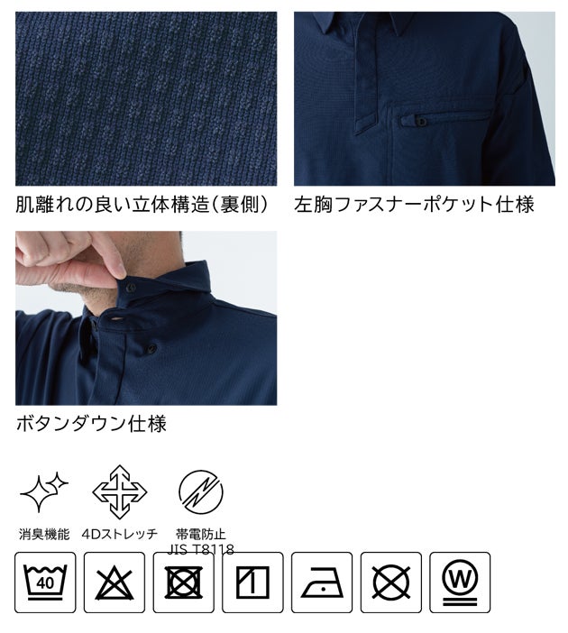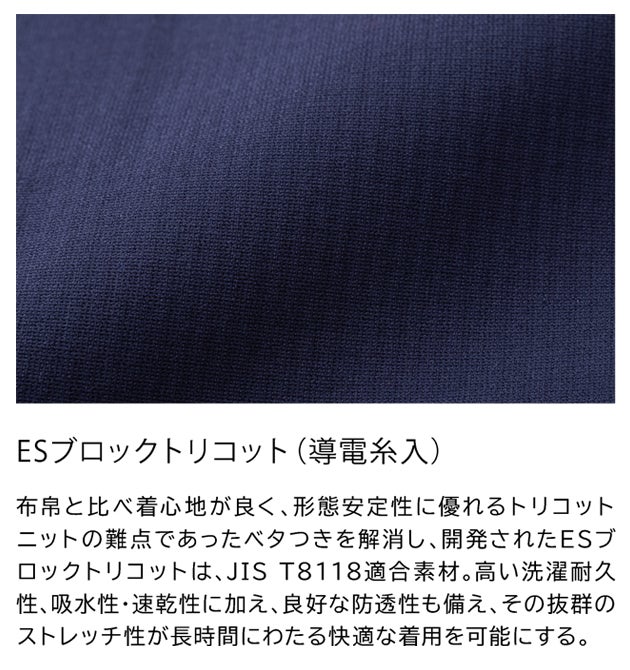 | 【特徴】 | JIS T8118規格適合の「静電気帯電防止作業服」 ベタつきを解消したドライポロシャツ ◆ESブロックトリコット(導電糸入) 布帛と比べ着心地が良く、形態安定性に優れるトリコットニットの難点であったベタつきを解消し、開発されたESブコックトリコットは、JIS T8118適合素材。 高い洗濯耐久性、吸水性・速乾性に加え、良好な防透性も備え、その抜群のストレッチ性が長時間にわたる快適な着用を可能にする。 ◆肌離れ性 ◆防透性 ◆消臭性 ◆形態安定性 ・肌離れの良い立体構造(裏側) ・左胸ファスナーポケット仕様 ・ボタンダウン仕様 |