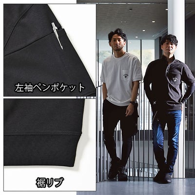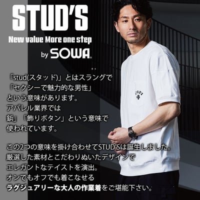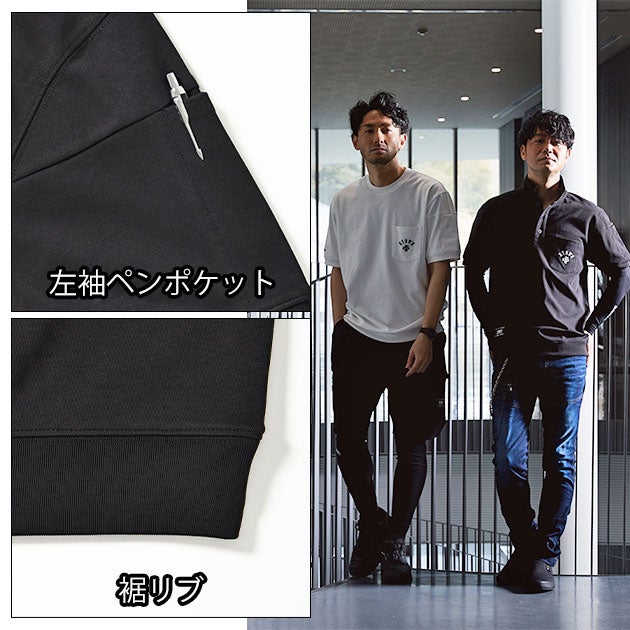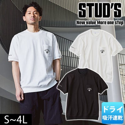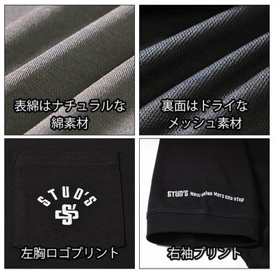 | 【特徴】 | 「STUD'S(スタッズ)」。 それは「大人の作業着」。 表は綿100%なのに肌面はドライメッシュ! カジュアルな見た目ながら機能性も併せ持ったスウェット風Tシャツ。 ◆表綿100%、裏ドライメッシュ 生地の表側は天然繊維特有のナチュラルな手触りとカジュアル感の強いマットな見た目に仕上がる綿100%生地を採用。 生地の裏側、肌に当たる面はポリエステル100%で速乾性があり、ドライな着心地が持続します。 さらに裏側はメッシュ構造になっているので肌離れも良く、汗によるベタつき等の不快感を軽減してくれます。 ◆軽くて、涼しくて、サラッと快適 スウェット風の見た目ながら裏をポリエステルのメッシュ構造にすることで、軽さ、通気性、サラッとした生地感がプラスされ、暑い夏も快適に過ごせます。 ◆スウェット感覚で着用できるON/OFF兼用Tシャツ 裾と袖口に太巾のリブを使用し、シルエットも少しゆったりめに仕上げることで、スウェット感覚で着用できます。 普段のTシャツスタイルとは一味違うON/OFF兼用のおしゃれアイテムに仕上げています。 ◆胸ポケット&袖ペン差し カジュアルな見た目ながら胸ポケットと袖ペン差し付きでワークシーンでもしっかり着用できます。 |