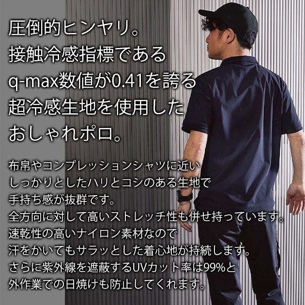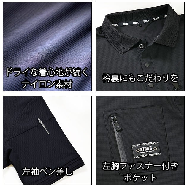 | 【特徴】 | 「STUD'S(スタッズ)」。 それは「大人の作業着」。 抜群の冷感性を誇るポロシャツが登場。 ◆ヒンヤリとした肌触りの超冷感生地 接触冷感の指標であるq-maxの数値が0.41を誇る超冷感生地を使用しているため、かなりヒンヤリとした接触冷感性があります。 ※q-maxの目安:個人差にもよりますが0.2で若干ヒンヤリ、0.3でヒンヤリ、0.4でかなりヒンヤリが一般的な目安と言われていますが体感には個人差があります。予めご了承ください。 ◆ハリコシ抜群のハイストレッチ生地 布帛やコンプレッションシャツに近いしっかりとしたハリとコシのある生地で手持ち感が抜群です。 またニット生地にポリウレタンを混紡しているので縦横斜め全方向に対して高いストレッチ性も併せ持っています。 ◆吸汗速乾×UVカット 速乾性の高いナイロン素材なので汗をかいてもサラッとした着心地が持続します。 さらに紫外線を遮蔽するUVカット率は99%と外作業での日焼けも防止してくれます。 ◆胸元や首のアクセント刺繍 胸ポケットや首まわり内側にはSTUDSのロゴを配置し、さりげなくおしゃれを演出! |