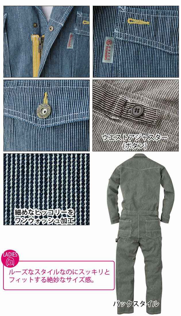 | 特徴 | ルーズなスタイルなのにスッキリとフィットする絶妙なサイズ感。 細目にアレンジしたヒッコリー柄がおしゃれなツナギからレディースタイプ登場! ■マジックテープ(袖口・ベルト) ■左右胸ポケットボタン ■フロントファスナー上部ボタン ■ハンマーループ ■ツールポケット ■ウエストアジャスター(ボタン) ■コインポケット・左袖ペン差し ※洗い加工の為、色落ち度に多少のばらつきがあります。 |