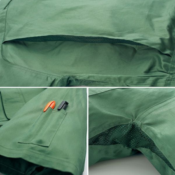 1、綿100% 2、ノーフォーク&ラグランスリーブ 3、左袖ペン差し 4、脇メッシュ |