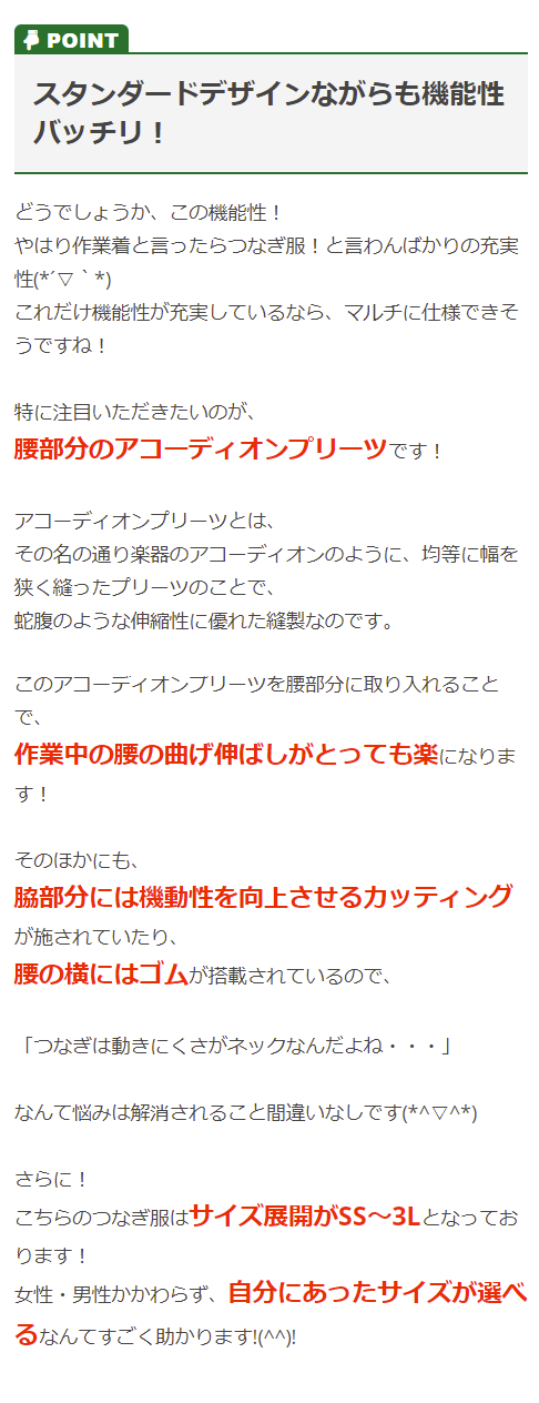 | 特徴 | マルチに使える10色展開のカラー続服登場! アコーディオンプリーツで腰の曲げ伸ばしが楽! ■胸ペン差し ■胸プリーツポケット ■携帯電話ポケット ■袖ペン差し ■腕が動かしやすい脇楽カット ■脇ゴム仕様 ■腰アコーディオン ・樹脂ファスナー ・袖口マジックテープ ・胸ポケット口マジックテープ ・目付量185g/m2 |