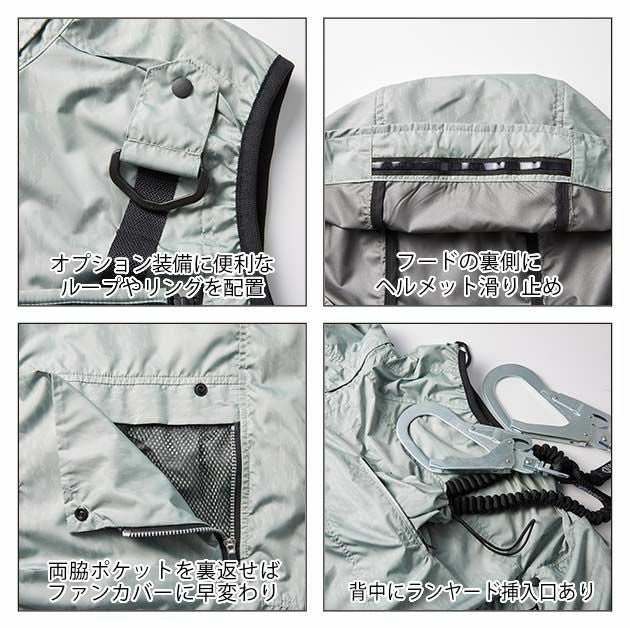 | 特徴 | ◆プルオーバータイプに見えるデザインですが、大きな胸ポケットがポイントの前開きエアーベスト ◆胸ポケットの左側はスマホが収まるサイズ設計 ◆後ろ脇のファン穴は落下防止メッシュが施された仕様 ・オプション装備に便利なループやリングを配置 ・フードの裏側にヘルメット滑り止め ・両脇ポケットを裏返せばファンカバーに早変わり ・背中にランヤード挿入口あり ・遮熱 ・限定商品 ・軽量 ・UVカット ・防透/遮光 |