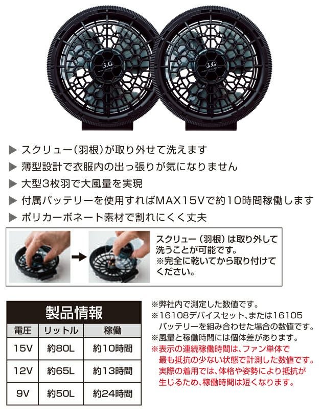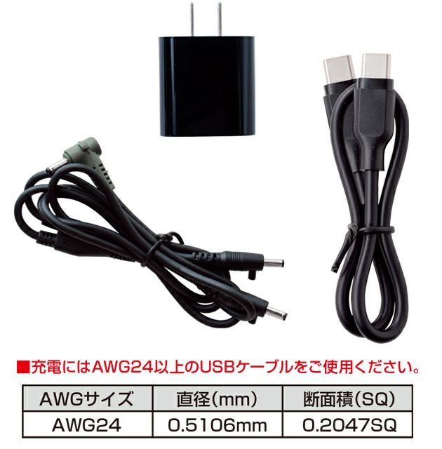 | 【特徴】 | 業界トップクラスの薄型。 高風量ファンを採用したデバイスセットハイパワーでロングドライブを実現。 新機能スクリュー脱着構造でお手入れ簡単。 ◆スクリュー(羽根)が取り外せて洗えます ◆薄型設計で衣服内の出っ張りが気になりません ◆大型3枚羽で大風量を実現 ◆付属バッテリーを使用すればMAX15Vで約10時間稼働します ◆ポリカーボネート素材で割れにくく丈夫 ◆スクリュー(羽根)は取り外して ◆洗うことが可能です。※完全に乾いてから取り付けてください。 【デバイスセット セット内容】 ・ファン(16111)…2個 ・ファンケーブル(16103)…1本 ・バッテリー(16105)…1個 ・ACアダプター(PD)(19304)…1個 ・USBケーブル(USBType-C to Type-C)…1本 ・取扱説明書…1通 電圧:リットル:稼働 15V/約80L/約10時間 12V/約65L/約13時間 9V/約50L/約24時間 ※弊社内で測定した値です。 ※16108デバイスセット、または16105バッテリーを組み合わせた場合の数値です。 ※風量と稼働時間には個体差があります。 ※表示の連続稼働時間は、ファン単体で最も抵抗の少ない状態で計測した数値です。実際の着用では、体格や姿勢により抵抗が生じるため、時間は短くなります。 【ファン/16111】 直径(ウェア取付部分):90mm 重量:約95g(ファン1個) 3枚羽 ※充電にはAWG24以上のUSBケーブルをご使用ください。 AWGサイズ:AWG24 直径(mm):0.5106mm 断面積(SQ):0.20478Q |