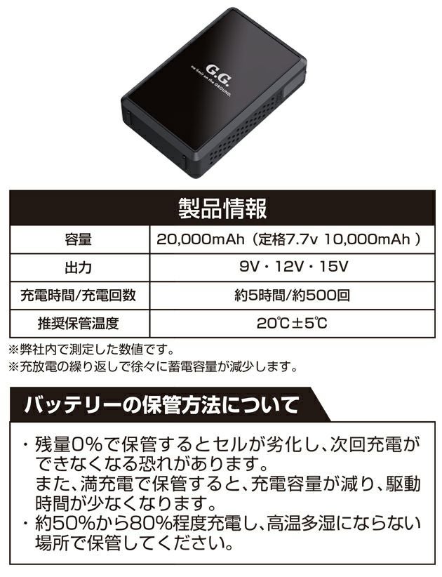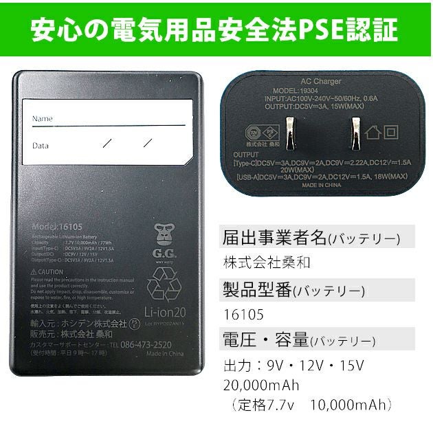 届出事業者名(バッテリー):株式会社桑和 製品型番(バッテリー):16105 PSマークの種類(バッテリー):PSE 出力:9V・12V・15V バッテリー容量:20,000mAh ACアダプター型番:19304 PSマークの種類(ACアダプター):PSE 登録検査機関名(ACアダプター):TUV SUD PSB Pte Ltd |