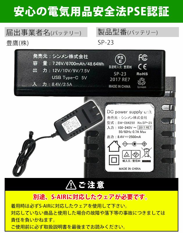 | 【特徴】 | 最大風量75リットルの12V+9Vで8時間連続稼働可能! 約4時間でフル充電できるコンパクトバッテリー! 静かで薄い新設計ファンは水洗いにも対応! ◆SP-23(バッテリー) 定格容量:7.26V・6,700mAh・48.64Wh 定格入力:8.4V/2.5A 定格出力:12V・10V・9V・7.5V 寸法:幅72mm×高さ108mm×厚さ22mm 重量:約245g 充電時間:約4時間 ◆SA-22(ファン)連続使用時間 12V(強):約3時間+約5時間(3時間後に9Vに切替) 10V(中):約9時間 9V(弱):約10.5時間 7.5V (弱):約16時間 ◆セット内容 ・バッテリー×1 ・ファン×2 ・二股コード×1 ・急速充電アダプター×1 |