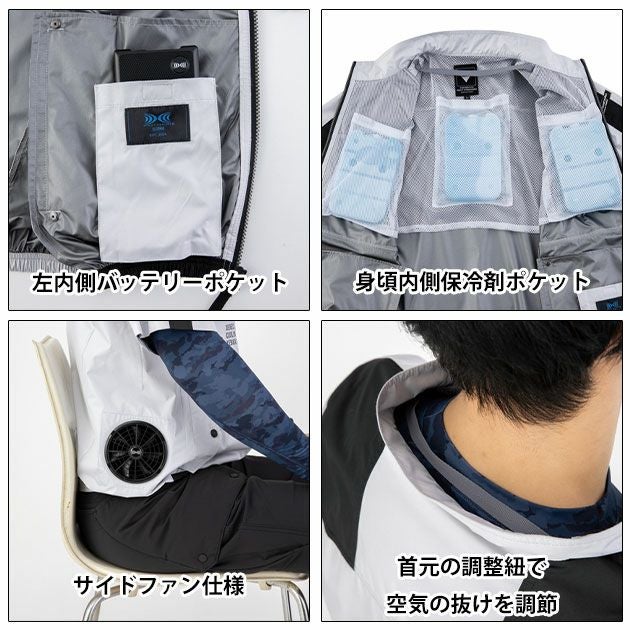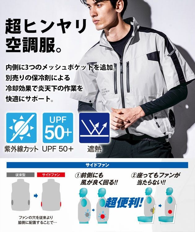 | 【特徴】 | 超ヒンヤリ!空調服! 内側に3つのメッシュポケットを追加し、別売の保冷剤を搭載可能! 炎天下の作業を快適にサポート! ◆座ってもファンが当たらない!前側にも風が回る!サイドファン! 従来よりもファンの位置を脇側に配置することで運転時など座った状態でもしっかり風を取り込むことが可能! サイドファンタイプで3L以上の場合は必ずロングケーブルをご使用ください。 ◆両胸ファスナーポケット ◆両脇フラップ付きポケット ◆左袖ペン差し ◆左内側バッテリーポケット ◆身頃内側メッシュ保冷剤ポケット ◆首元の調整紐で空気の抜けを調節可能 ◆袖口ドットボタンで空気の抜けを調整可能 この商品は (株)セフト研究所・(株)空調服の特許及び技術を使用しています。 「空調服(R)」は(株)セフト研究所・(株)空調服のファン付きウェア、その附属品、及びこれらを示すブランドです。 「空調服(R)」、「DC空調服」ロゴは、(株)セフト研究所・(株)空調服の登録商標です。 |