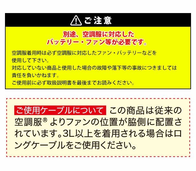 | 【ご使用時の注意】 | ・この商品はブルゾンのみです。別途ファン・バッテリーが必要です。 ・空調服着用時は対応のファンバッテリーをご使用ください。 ・取り扱い説明書をお読みいただき、正しくご使用ください。 ・3L以上の場合、ロングケーブルが必要です。 |