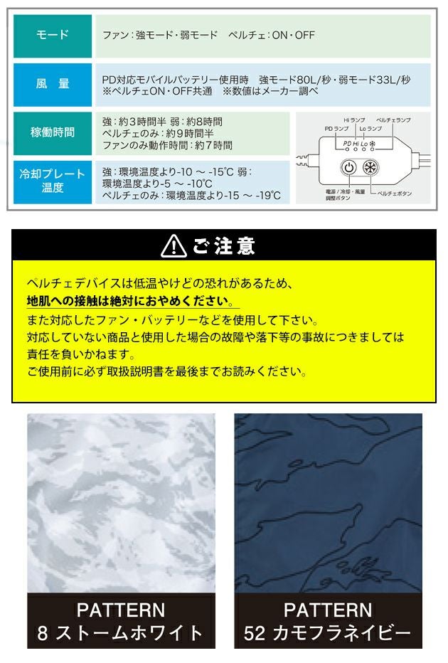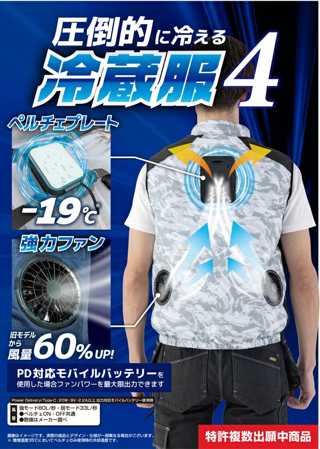 | 【特徴】 | 裏側全面チタンコーティングで紫外線や赤外線をカットすることでウェア内の温度上昇を抑える遮熱効果を実現! ◆特許複数出願中製品! ◆冷却プレートと送風ファンで身体をW冷却! ◆業界最大!小型冷蔵庫と同じ機構の大型冷却プレートを採用、電源ONから3秒で冷却 ◆完全排気システム 背面の完全排気システムで熱気を効率よく服の外に排出!冷蔵服最大の特徴です。 ◆冷却プレートと身体を密着させるフィットシステム搭載 ◆風量2段階+冷却プレートON・OFFモード切替可能 ◆パワーデリバリーモバイルバッテリー対応で旧モデルから風量が大幅にアップ! ◆フィットシステム搭載 ペルチェプレートが身体に密着することで、効果的に身体を冷却! ◆強力ファン 旧モデルから風量60%UP! ◆デバイスを取り外して洗濯可能 ※環境温度35℃においてペルチェのみ使用時の冷却温度です。 ◆PD対応モバイルバッテリーを使用した場合ファンパワーを最大限出力できます ◆安心のPSEマーク取得製品! 届出事業者名(バッテリー):サンコー株式会社 製品型番(バッテリー):TKMB25HBK PSマークの種類(バッテリー):PSE ・バッテリーポケット ・脇ポケット/ケーブルホール ・保冷剤用メッシュポケット ・右胸/ファスナーポケット ・左袖ペン差し 本製品を使用するにはUSBType-C出力ポート搭載のモバイルバッテリーが必要です。 PD対応モバイルバッテリー20W・9V-2.2A出力以上、もしくはモバイルバッテリー5V-2.0A出力以上のものをご使用ください。 ACアダプター、モバイルバッテリーによっては、相性によりご使用いただけないものがあります。 本製品はPD(UniversalSerialBusPowerDelivery)対応です。 PD対応のモバイルバッテリーは、従来のUSBと比べ、大量の電力供給を行うことができます。 そのためPD対応となっているモバイルバッテリーを接続すると、従来のモバイルバッテリーよりもファンの風量が強くなります。 ※冷却性能は従来のモバイルバッテリーと変わりません。 【セット内容】 ・冷蔵服4半袖ジャケットTH604 ・バッテリー TH9225 ・ファン×2 ・ペルチェプレート ・日本語取扱説明書 ・USBケーブル ※充電用のアダプターは付属しておりません。 ※PDモバイルバッテリー対応の充電アダプターをご使用ください。 バッテリー容量:3.7v:20000mAh(74Wh) サイズ:縦142mm横70mm高さ29mm 重量:422g 出力ポート USBType-C:5V/3A,9V/2.22A,12V/1.67A20WMax USBType-A:5V/3A,9V/2A,12V/1.5A18WMax 入力ポート:USBType-C:5V/3A,9V/2A,12V/1.5A18WMax バッテリータイプ:リチウムイオンポリマー 充電時間:急速充電時9V/2A:約7時間 通常充電時:5V/2A:約10時間(※状況により異なります) 互換性:冷蔵服4/TH604/TH605/TH606のデバイスのみ対応、冷蔵服3/TH603のデバイスには対応していません |