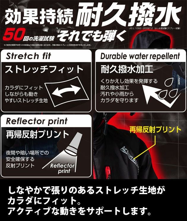 | 特徴 | 50回もの洗濯試験を行っても水をはじく抜群の撥水性。 さらに、しなやかで張りのあるストレッチ生地がカラダにフィット。 ◆ストレッチフィット カラダにフィットしながらも動きやすいストレッチ生地。 アクティブな動きをサポートします。 ◆耐久撥水加工 繰り返し効果を発揮する耐久撥水加工。 汚れや小雨からカラダを守ります。 ◆再帰反射プリント 夜間や暗い場所での安全を確保する反射プリント。 ワーク・スポーツ・アウトドアなど、 様々なシーンで活躍間違いなしの1着です!! |