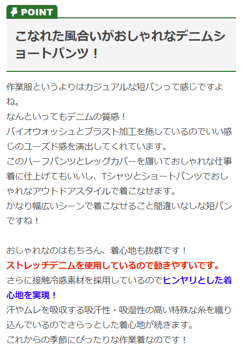 | 特徴 | ヒンヤリ冷感で抜群の着心地! 接触冷感と吸汗機能を併せ持つデニム生地を採用! 超伸びストレッチ素材でスリムシルエットながら動きやすい! ◆吸汗性・吸湿性に優れたストレッチサマーデニムを採用 汗を素早く吸収・蒸発させ、気化熱による冷感性を持たせた夏の現場に最適なデニム素材。 ◆右脇コインポケット ◆フロントファスナーは丈夫な3YGファスナー ◆両脇フラップ付きカーゴポケット ◆両脇Dカンループ付き ◆右後ろポケットに小ポケット付き |