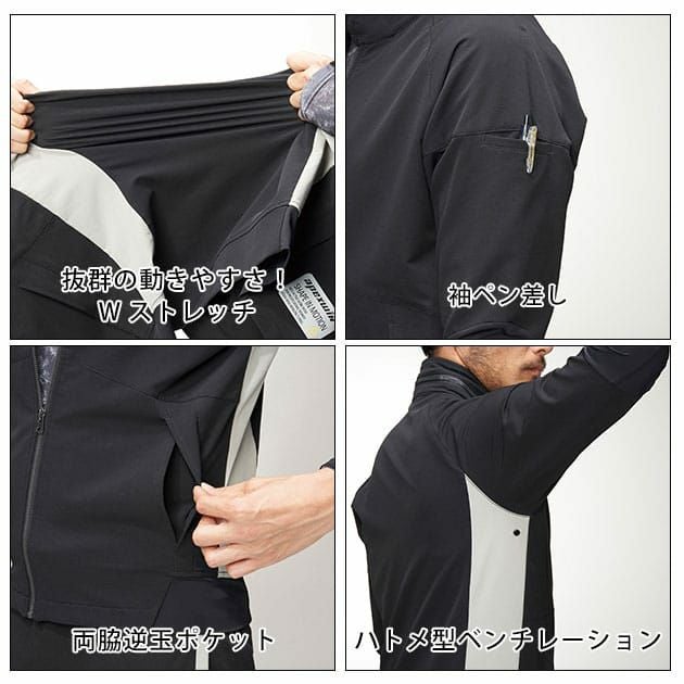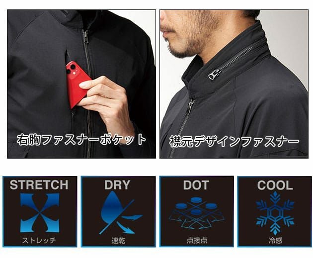| 特徴 | ヒンヤリとしてさらりとした点接触冷感素材とストレッチ性を搭載! 次世代のハイブリッドワークウェア登場。 絶妙な切り替えバランスで手足のフィット感を向上。 着た時のもたつきを軽減し、ストレスフリーな着心地を実現! ◆Wストレッチ ◆袖ペン差し ◆ハトメ型ベンチレーション ◆両脇逆玉ポケット ◆右胸ファスナーポケット ◆襟元デザインファスナー |