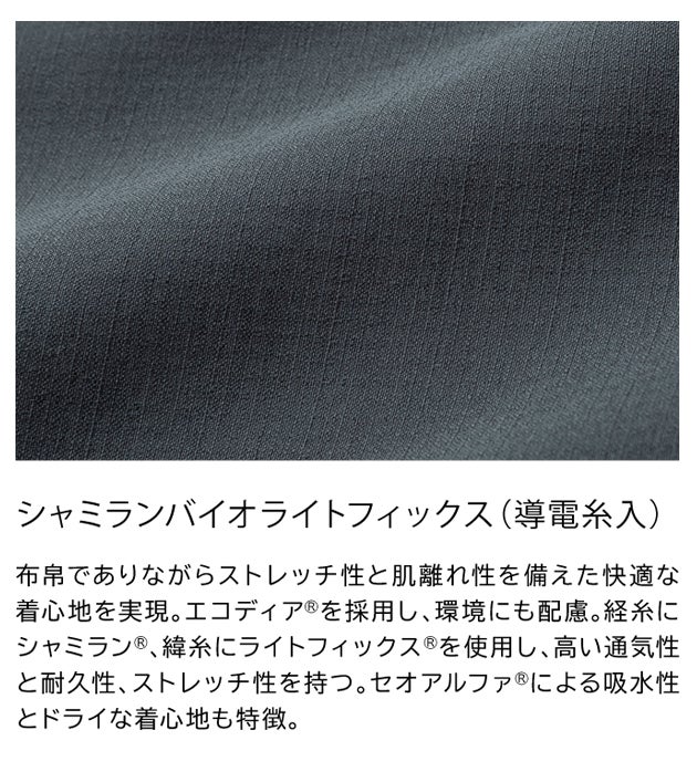 | 【特徴】 | JIS T8118規格適合の「静電気帯電防止作業服」 高い通気性と耐久性を持つ快適工コ素材 ◆シャミランバイオライトフィックス(導電糸入) 布帛でありながらストレッチ性と肌離れ性を備えた快適な着心地を実現。 エコディア(R)を採用し、環境にも配慮。 経糸にシャミラン(R)、緯糸にライトフィックス(R)を使用し、高い通気性と耐久性、ストレッチ性を持つ。 セオアルファ(R)による吸水性とドライな着心地も特徴。 ◆軽量性 ◆ストレッチ ◆通気性 ◆シャミランによる耐久性、肌離れ性、吸水速乾 ◆付属は全て樹脂素材を採用 ・反射機能 ・両脇ウエストゴム仕様 |