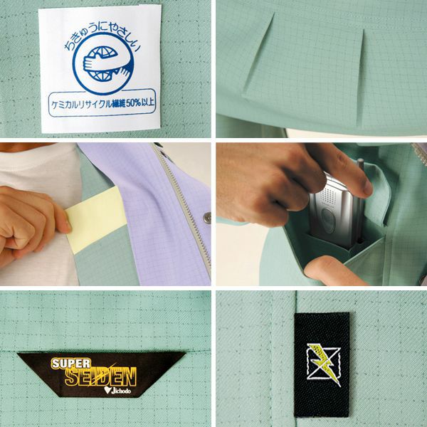 1、携帯電話収納ポケット 2、衿吊り 3、ワンポイント 4、エコマーク 5、内ポケット 6、肘タック 7、縫製仕様(低発麈仕様) 8、帯電防止素材使用 9、低発塵 10、帯電防止JIS規格合格商品 11、清浄度クラス1000 12、エコマーク認定商品 13、グリーン購入法判断基準対応 14、新原料リサイクル回収対応(ケミカルリサイクル) 15、ペアコーディネート |