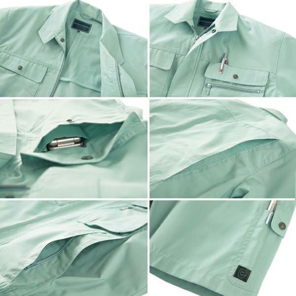 1、背裏メッシュ 2、ノーフォークメッシュ 3、脇ダブルポケット 4、右胸携帯ポケット 5、左袖ペン差 エコマーク商品(グリーン購入法適合) 6、左胸ペン差し・Wポケット 7、ペットボルト リサイクル繊維 8、制電素材 9、ポプリン 10、ECOPET 11、ECOCLEAN |