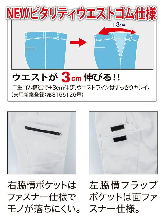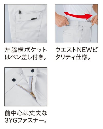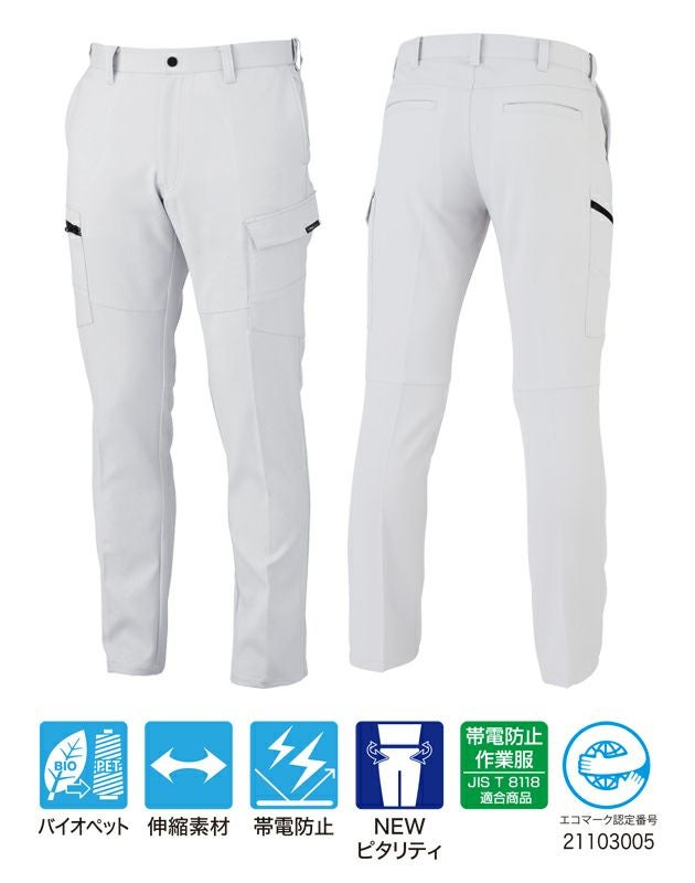 | 特徴 | SDGsに貢献! 環境に配慮したバイオベース(植物由来)の原料をポリエステルに採用したワークウェア登場。 さらにストレッチ素材で着心地も抜群。 ◆バイオペットリサイクル素材採用 ◆暖かくムレにくい裏綿素材 ◆JIST8118帯電防止作業服適合 ◆エコマーク認定商品 ◆右脇横ポケットはファスナー仕様で物が落ちにくい ◆左脇横ポケットはペン差し付き ◆左脇横フラップポケットはマジックテープ仕様 ◆ウエストNEWピタリティ仕様 ◆フロントファスナーは丈夫な3YGファスナー採用 |