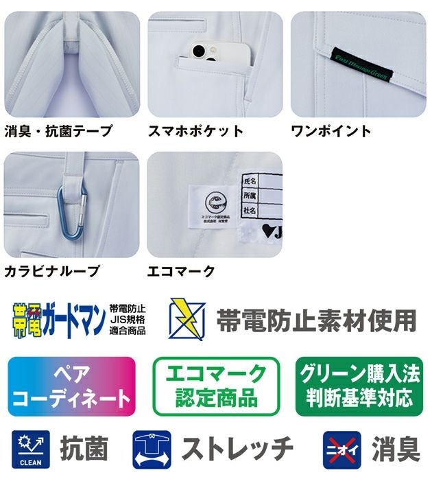| 【特徴】 | 表素材に再生PET繊維を100%使用したワークウエア。 企業のSDGsへの取り組み、環境活動に貢献する環境配慮型商品。 「Jichodo Field message Green」新登場! 表素材だけでなく、付属にも環境配慮型の材料を使用。 衣服を構成する生地のみならず、ファスナー(基布)や芯地、織ネームにいたる細部まで徹底的にSDGsにこだわった持続可能な社会実現を目標とした、環境配慮型ユニフォームを提供します。 ◆帯電防止素材使用 ◆ストレッチ ◆抗菌 ◆エコマーク認定商品 ◆グリーン購入法判断基準対応 ◆消臭 |
