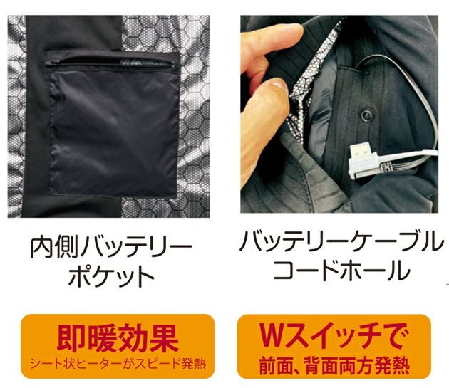 | 【特徴】 | HUMMERから蛇腹状のニット生地が織りなす新感覚3Dヒートベストが新登場。 着た瞬間から暖かい高機能発熱体カーボンナノチューブと線状の発熱体カーボンファイバーを配したハイブリッド仕様。 裏地にグラフェンプリントを採用することで熱伝導率を更に高めた多機能モデル。 ◆カーボンナノチューブ ◆カーボンファイバー ◆ハイブリッド ◆前面背面W発熱 ◆中綿 ◆裏グラフェン ◆手洗い可 ・前後ニット切り替え ・両脇ポケット ・左脇プリント ・背中プリント ・内側バッテリーポケット ・側面ハイテンション ・位置切り替え ・防水キャップ付き ・裾調整スピンドル ・バッテリーケーブル ・ニット ・Wスイッチ ・USB端子 ・コードホール ※80000はバッテリーと充電用USBケーブルのセットです。ACアダプターは付属しておりません。 ※バッテリーは400665以外に、市販のモバイルバッテリーもご利用いただけます。 【セット内容】 ・ヒートベスト ・専用USBバッテリー ・充電用USBケーブル(長さ:25cm) |