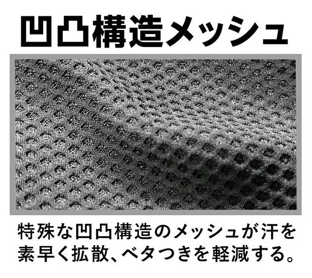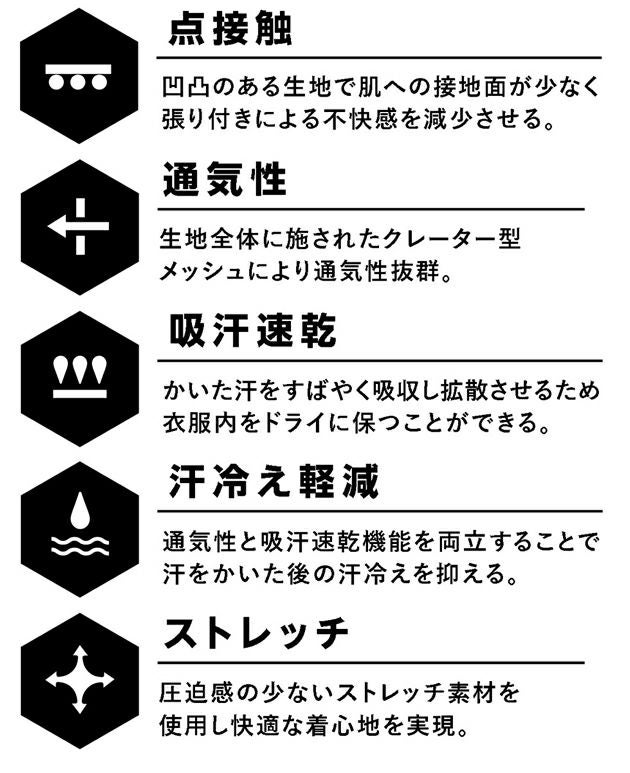 | 【特徴】 | オールシーズン対応、高機能次世代インナー 生地の凹凸面が汗を拡散しベタツキ感を抑える ◆凹凸構造メッシュ 特殊な凹凸構造のメッシュが汗を素早く拡散、ベタつきを軽減する。 ◆点接触 凹凸のある生地で肌への接地面が少なく張り付きによる不快感を減少させる。 ◆通気性 生地全体に施されたクレーター型メッシュにより通気性抜群。 ◆吸汗速乾 かいた汗をすばやく吸収し拡散させるため衣服内をドライに保つことができる。 ◆汗冷え軽減 通気性と吸汗速乾機能を両立することで汗をかいた後の汗冷えを抑える。 ◆ストレッチ 圧迫感の少ないストレッチ素材を使用し快適な着心地を実現。 ◆前開き仕様 |