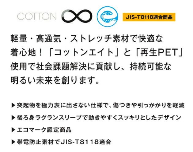 | 【特徴】 | 軽量・高通気・ストレッチ素材で快適な着心地! 「コットンエイト」と「再生PET」使用で社会課題解決に貢献し、持続可能な明るい未来を創ります。 ◆突起物を極力表に出さない仕様で、傷つきや引っかかりを軽減 ◆後ろ身ラグランスリーブで動きやすくスッキリとしたデザイン ◆エコマーク認定商品 ◆帯電防止素材でJIS-T8118適合 ◆ハイストレッチで高通気!伸縮性と回復性を兼備しつつ、高通気を実現したTC素材。 ◆可動域がアップするサイドベンツ 両サイドに施したサイドベンツで作業時の足掘きがしやすく動作範囲が広がります。 スナップボタン付きで開閉も可能です。 ・右側マルチ小ポケット ・左ファスナー付きカーゴポケット ・右脇コインポケット ・股消臭テープ ・両脇カラビナループ ・膝ダーツ ・膝裏反射テープ |