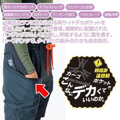 | 【特徴】 | カーゴポケットがこんなにデカくて良いのか!?!? 必需品をラフに放り込める両サイドデカポケットを搭載したハーフパンツが登場! 戦略的に配置されたパンチングがムレを排除し、呼吸するようにを通す! ハーフパンツタイプだからタイツやレッグカバーとの相性も抜群! ◆接触冷感生地とパンチング生地採用 ◆両脇デカカーゴポケット ◆ウエストゴム仕様 ◆ベルトループ ◆タテヨコストレッチ ◆フロントファスナー ◆ひざ上丈 |