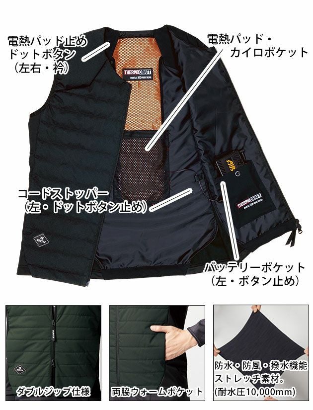 | 特徴 | エアークラフトのバッテリーが使える! 防寒ベスト&サーモクラフトのセット。 <3214> サーモクラフト(電熱パッド)装着対応モデル 防水・防風・撥水機能ストレッチ素材(耐水圧10,000mm) フロントファスナーダブルジップ仕様 ライトアウター・インナーとして両着用可能アイテム 男女ユニセックス 両脇ボンディング素材 電熱パッド止めドットボタン(左右・衿) 電熱パッド・カイロポケット コードストッパー(左・ドットボタン止め) バッテリーポケット(左・ボタン止め) <TC250> 質量:約90g 対応バッテリー:AC260、AC230、AC210 設定温度※1:13V/52℃、10V/45℃、8V/40℃、6V/35℃ 連続稼働時間(AC260使用時)※2:13V/1時間+10V(3時間)※3、10V/4.5時間、8V/7.5時間、6V/14時間 ■セット内容■ 防寒ベスト×1 電熱パッド×1 取扱説明書/保証書×1 ※エアークラフトバッテリーは別売りとなります |