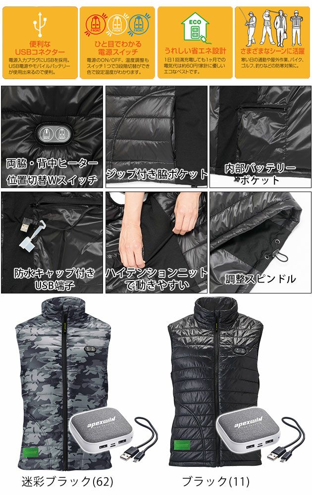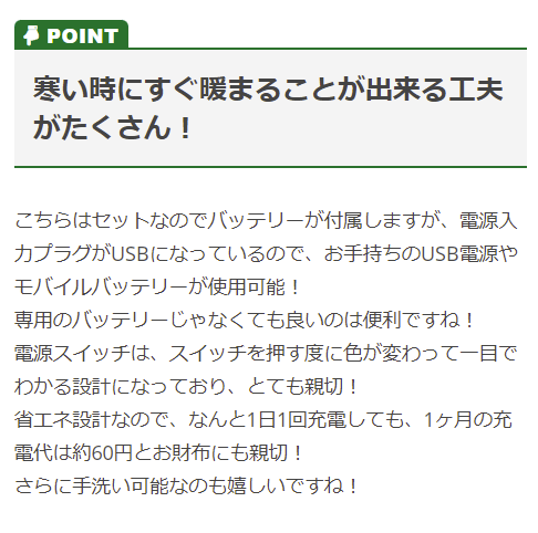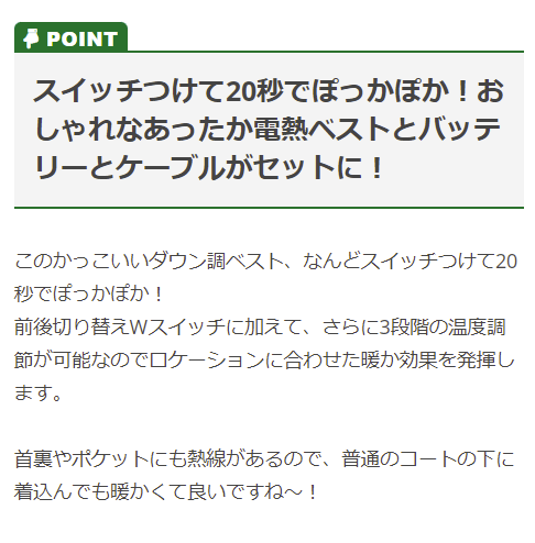 | 特徴 | スイッチつけて20秒でぽっかぽか。 前後切り替えWスイッチ×調節温度3段階で、いつでもどこでもヒートコントロールが思いのままに。 寒い日の通勤や屋外作業、バイク、ゴルフ、釣りなどの防寒対策にも最適です! ◆電源入力プラグにUSBを採用。USB電源やモバイルバッテリーが使用できるので便利 ◆ひと目でわかる電源スイッチ ◆嬉しい省エネ設計 (1日1回充電しても、1ヶ月の充電代は約60円!) ◆防風 ◆ストレッチ ◆全面背面W発熱 ◆手洗い可 ◆位置切り替えWスイッチ ◆ジップ付き脇ポケット ◆内側バッテリーポケット ◆防水キャップ付きUSB端子 ◆ハイテンションニット ◆調節スピンドル |