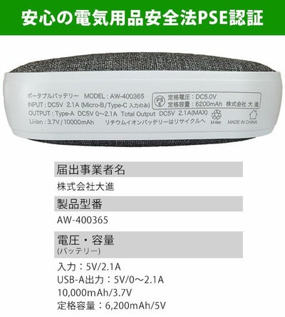 | バッテリー容量:10,000mAh/3.7V 定格容量:6,200mAh/5V |