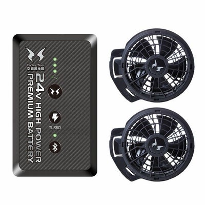 | 【特徴】 | コレさえ買えば悩む必要なし! 空調風神服2024年モデルファンバッテリーセット! 後はお好みのウェアを買えばすぐに使えます! より長持ちするバッテリーと業界トップクラスの風量のファンで夏を快適に! ◆セット内容:バッテリー×1、充電アダプター×1、ファン×2、ファンケーブル×1 ▼バッテリーRD9490PJ▼ 強大なボルト数はそのままに。 さらにグレードアップして登場! バッテリーのセル数をパワーアップし、より長持ちするバッテリーに! ・新機能「ターボモード」! 24Vで最大風量100リットルを実現。(5分間) さらに「強」の場合は約8時間も連続稼働できます! ・アプリで操作できる! 空調風神服アプリを使えばスマホで風量を調節できます。 さらにアプリで1V単位で調整可能にグレードアップ! ・連続稼働時間 TURBOモード:約5分(24V) HIGH(強)モード:約8時間(15V) MIDDLE(中)モード:約12時間(12V) LOW(弱)モード:約24時間(9V) ※ターボモード使用後は自動的に通常モードに切り替わります ・バッテリー重量:約330g(5セル) ・Sマーク取得 ・充電所要時間約3.5時間 ・安心の日本製バッテリー ・難燃・簡易防水仕様 ・USBポート搭載 ・IN/OUTPUT一体型(ブルー) ▼フラットファンRD9420PH▼ 業界トップクラスの風量のファンが登場! ウェアから飛び出ないフラットファン! ・ファンの仕様 ファンの厚さ:42mm ファンの重量:約105g(1個) 最大風量:約6.0m3/min(24V駆動時) ・カバーを取り外して清掃可能(水洗い不可) ・ワンタッチで簡単装着 |