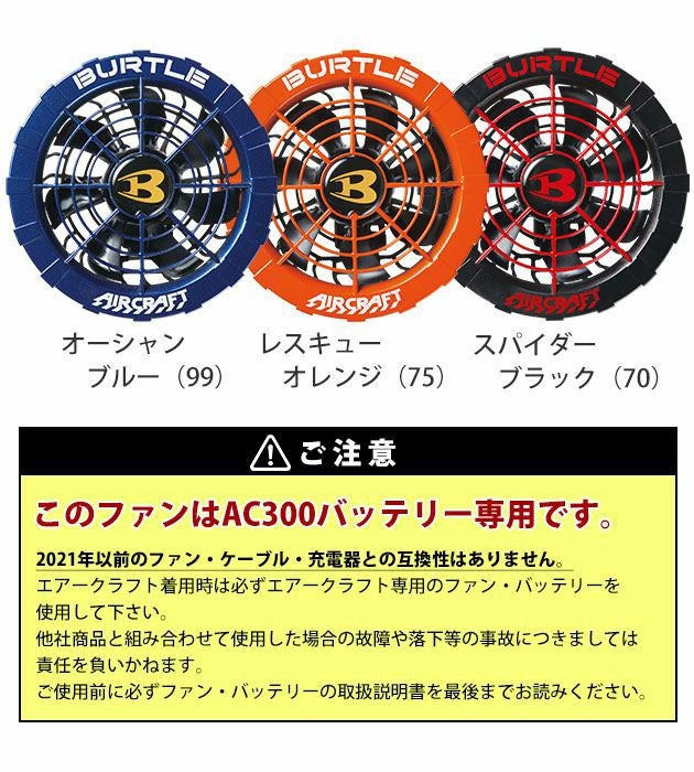 | 【重要】ご使用時の注意 | ◆こちらのバッテリーはAC300専用のファンです。 旧製品のファンに使用すると故障の原因となりますのでご注意下さい。 ◆バッテリー・ウェアは別売りです。 ◆エアークラフト着用時はエアークラフト専用のファン・バッテリーを必ずご使用ください。 付属の取扱説明書をよく読み、正しくご使用ください。 |