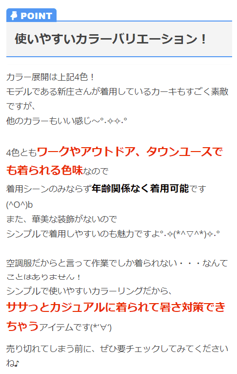 | 【重要】ご使用時の注意 | ファン・バッテリーは別売りです。 空調服着用時は必ず対応するファン・バッテリーをご使用ください。 取扱説明書をよく読み、正しくご使用ください。 |