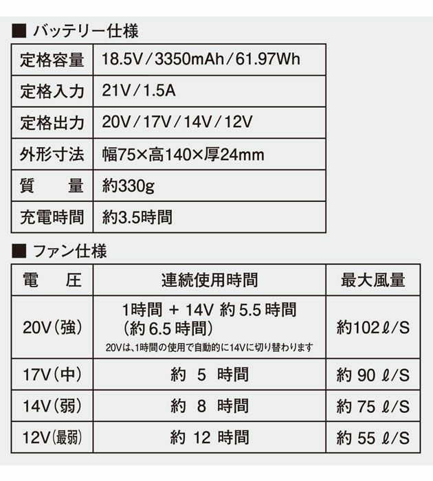 | 【特徴】 | S-AIR史上最強空調作業服、登場。 2023年モデルよりもさらにパワーアップ! 最大102リットル/秒の風量を実現。 急速充電等の機能はそのままに騒音の軽減などをプラスさせ、スペックを高めた2024年モデル登場! ◆20Vの高出力で最大102リットル/秒の風量を実現 ◆20Vから出力を自動で下げる制御で連続6.5時間使用が可能に ◆急速充電アダプターで約3.5時間でフル充電 ◆バッテリー高温時に故障回避の為一時的に動作を停止させる保護機能付き ◆セット内容…20V専用パワーファン×2、10Vバッテリー×1、二股コード×1、充電器×1、保証書説明書×1 ◆バッテリー仕様 寸法:75×140×24mm 重量:約330g 定格容量:18.5V/3350mAh/61.97Wh 定格入力:21V/1.5A 定格出力:20V/17V/14V/12V ◆ファン仕様 20V(強):1時間+14V約5.5時間(102リットル) 17V(中):約5時間(90リットル) 14V(弱):約8時間(75リットル) 12V(最弱):約12時間(55リットル) (20Vは1時間で自動的に14V) |