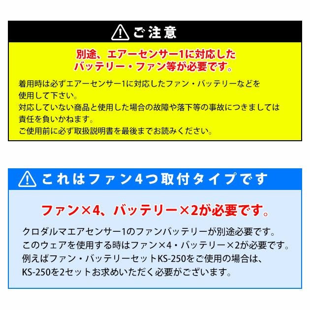 | 【ご注意】 | ・バッテリー・ファンなどのデバイスは付属していません。 ・ファンを4つ使用する場合、ファン4つとバッテリー2つが必要です。 ・デバイスはクロダルマエアセンサーワンシリーズをご使用ください。 |