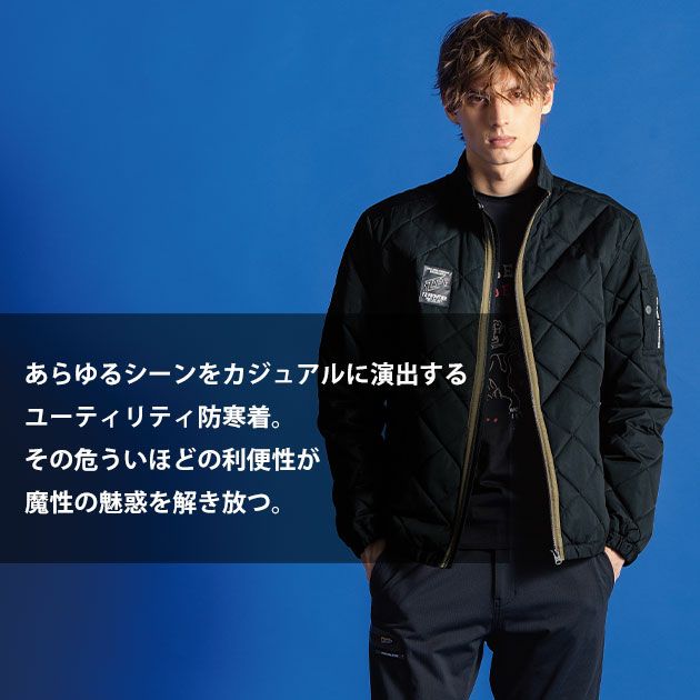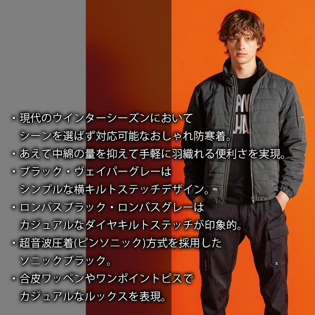 | 【特徴】 | あらゆるシーンをカジュアルに演出するユーティリティ防寒着。 その危ういほどの利便性が魔性の魅惑を解き放つ。 ◆現代のウインターシーズンにおいてシーンを選ばず対応可能なおしゃれ防寒着。 ◆手軽に羽織れる便利さを実現するためにあえて中綿の量を抑えた。 ◆強度と高級感のあるルックスを両立したピーチ起毛を採用し防寒着としてのクオリティーを高めてます。 ◆ブラック・ヴェイパーグレーはシンプルな横キルトステッチデザイン。 ◆ロンバスブラック・ロンバスグレーはカジュアルなダイヤキルトステッチが印象的。 ◆超音波圧着(ピンソニック)方式を採用したソニックブラック。 ◆合皮ワッペンやワンポイントピスでカジュアルなルックスを表現。 ◆程よく首にフィットするチンガード付きの襟元 ◆右胸ファスナー付き内ポケット ◆スタイリッシュなペン差しポケット ◆ファスナー付き両脇ポケット |