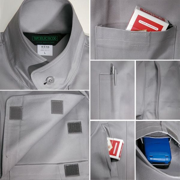 1、携帯電話収納ポケット(左胸) 2、内ポケット 3、背ノーフォーク 4、袖ペンポケット(左) 5、脇両サイド逆玉ポケット 6、衿先and袖口は溶接プロ仕様 7、ダブル補強(胸部分) |