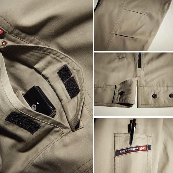 | 特徴 | : | 1、ボディクーラー(胴脇両サイド部メッシュ仕様) 2、携帯電話収納ポケット(右胸) 3、内ペンポケット 4、背アームノーフォーク 5、袖アームタック 6、ウエストスリットロットアジャスター(脇ゴムなし) 7、袖ペンポケット(左) |