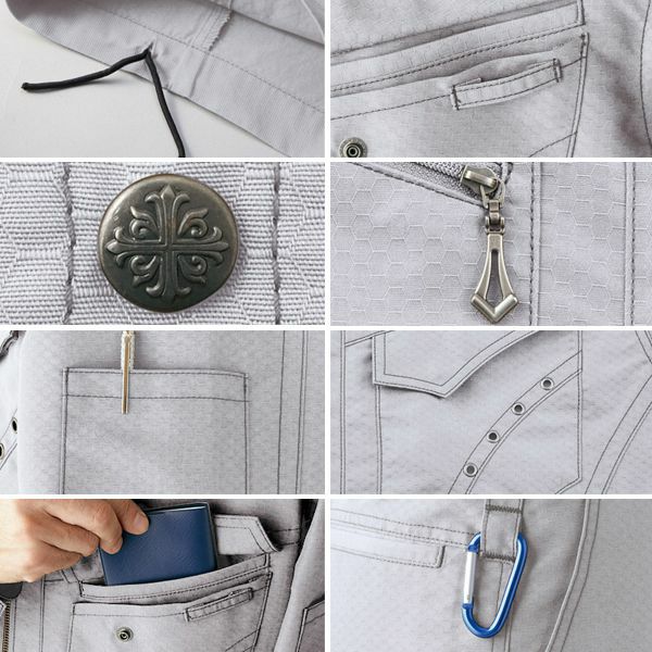1、背当てプリント 2、消臭&抗菌テープ(両脇・両肩) 3、デザインファスナー持ち手 4、袖カフス釦 5、左胸二重ポケット 6、左袖ペン差し 7、背中、左胸ポケットループ付 8、5連アイレット 9、Jawinロゴ刺繍 |