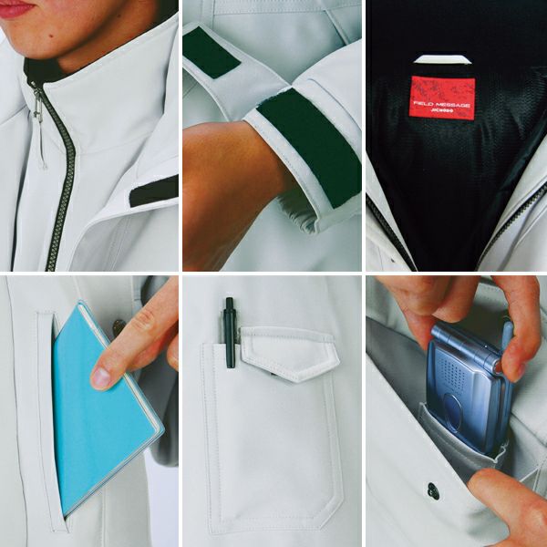 1、背ネーム 2、衿フリース仕様 3、背当てメッシュ 4、二重衿仕様 5、二重前立て 6、携帯電話収納ポケット 7、ワンポイント 8、左袖機能ポケット(ペン差し付) 9、肘タック 10、内ポケット 11、オリジナルデザインボタン(胸) 12、オリジナルデザインボタン 13、袖口アジャスター 14、帯電防止素材使用 15、撥水加工 |
