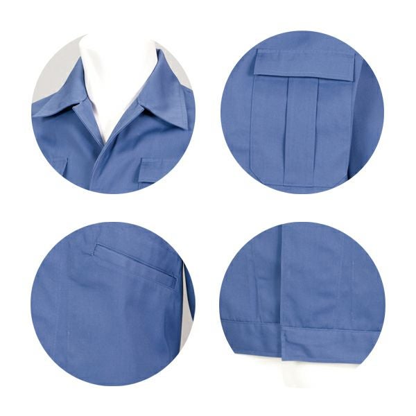 1、右胸携帯電話入ポケット 2、左袖ペン差し 3、ループ釦 4、氏名片布 5、左胸ペン差し 6、エコマーク 7、帯電防止素材使用 8、形態安定性 |