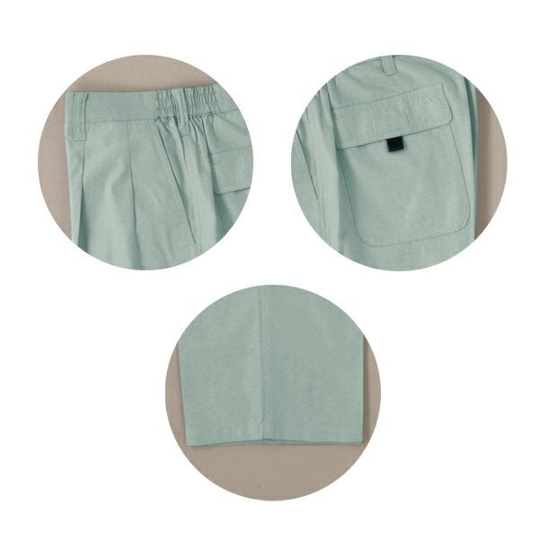 1、ツータック 2、両側マジックテープ付ポケット 3、ウエスト脇ゴム付 4、右側ファスナー付ポケット 5、製品洗い |