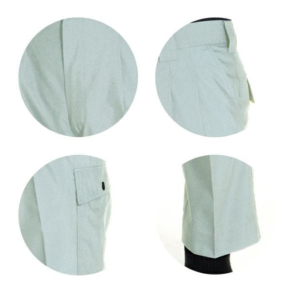 1、マジックテープ・ファスナー付ポケット 2、ツータック 3、携帯電話入ポケット 4、ゲルマニウム練り込み繊維付属使用 5、帯電防止素材使用 6、形態安定性 7、吸汗・速乾 |