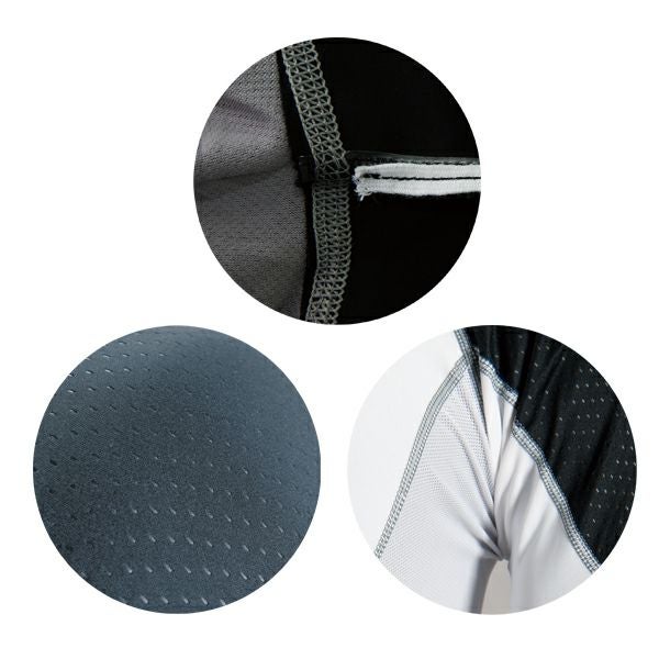1、肩部分補強(当て布2重使い) 2、接触冷感 3、吸汗速乾 4、UVカット 5、消臭機能 |